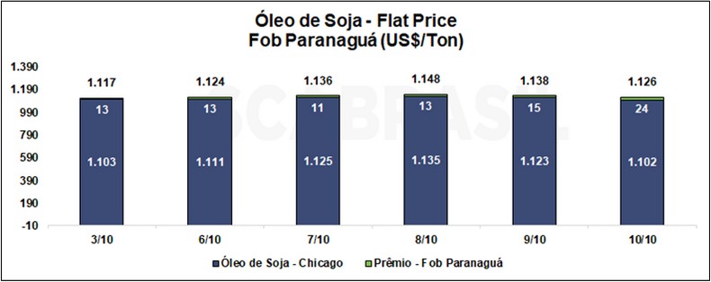 O contrato de dezembro/2025 do óleo de soja negociado na Bolsa de Chicago encerrou em 49,97 cents/libra na sexta-feira (10/10), apresentando desvalorização de 0,16% na semana. O prêmio de novembro/2025 do óleo de soja em FOB Paranaguá subiu 50 pontos, fechando a semana em 1,10 cents/libra. O flat price do óleo de soja FOB Paranaguá fechou em US$ 1.125,90/ton, uma leve valorização (+0,83%) em relação à semana anterior.