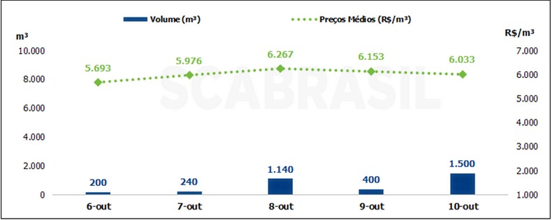 No levantamento realizado pela SCA Brasil, o mercado spot de biodiesel teve na semana um volume de vendas de 3.480 m³, um aumento superior a 2.000 m³ em relação à semana anterior, com o destaque para o estado de São Paulo com volume comercializado de 1.980 m³. O preço médio apurado na semana foi de R$ 6.100/m³, com PIS/COFINS e sem ICMS, praticamente estável em relação à semana anterior.