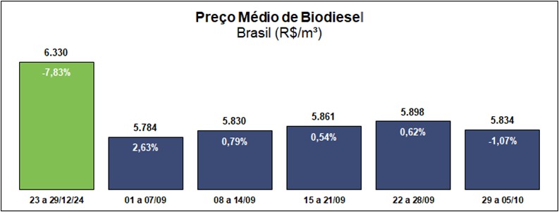 Segundo o levantamento realizado entre 29/09 e 05/10 pela Agência Nacional de Petróleo, Gás Natural e Biocombustíveis (ANP), o preço médio do biodiesel negociado entre usinas e distribuidores ficou em R$ 5.834,23, desvalorização de 1,07% em relação ao valor médio da semana anterior. As maiores desvalorizações foram nas regiões Centro-Oeste e Sul, com desvalorização de 3,20% e 2,87%, respectivamente. O mercado acumula uma redução de 7,83% no ano.