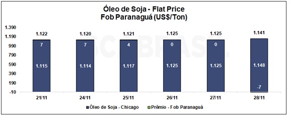 O contrato de janeiro/2025 do óleo de soja negociado na Bolsa de Chicago (CBOT, na sigla em inglês) encerrou em 52,05 cents/libra na sexta-feira (28/11), apresentando valorização de 2,91% na semana. O prêmio de janeiro/2025 do óleo de soja em FOB Paranaguá perdeu60 pontos, fechando a semana em -0,30 cents/libra. O flat price do óleo de soja FOB Paranaguá fechou em US$ 1.140,89/ton, uma valorização de 1,71% em relação à semana anterior.