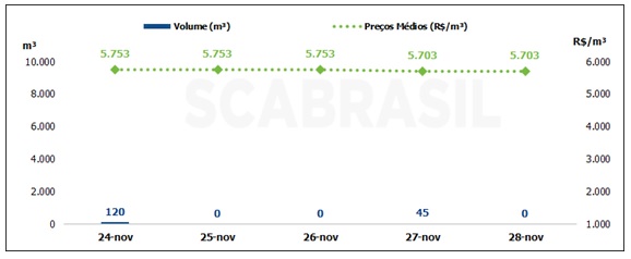 No levantamento realizado pela SCA Brasil, o mercado spot praticamente não apresentou movimentação, com um volume apurado de somente165 m³na semana, o menor volume que registramos desde o início do mercado livre de biodiesel. O preço médio apurado na semana foi de R$ 5.739/m³, com PIS/COFINS e sem ICMS, com uma leve desvalorização de 3,8% em relação à semana anterior.