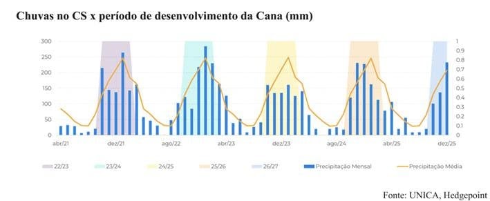 “Nossas estimativas preliminares sugerem que, apesar dos dados ainda incompletos considerando que o período crítico de desenvolvimento da cana-de-açúcar ocorre entre outubro e fevereiro, é possível atingir até 630 milhões de toneladas de cana”, diz.
