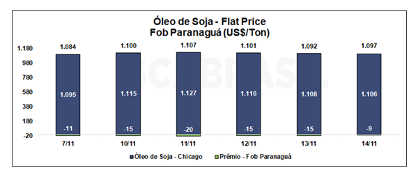 O contrato de dezembro/2025 do óleo de soja negociado na Bolsa de Chicago (CBOT, na sigla em inglês) encerrou em 50,15 cents/libra na sexta-feira (14/11), apresentando valorização de 0,95% na semana. O prêmio de dezembro/2025 do óleo de soja em FOB Paranaguá ganhou 10 pontos, fechando a semana em -0,40 cents/libra. O flat price do óleo de soja FOB Paranaguá fechou em US$ 1.096,80/ton., uma valorização de 1,16% em relação à semana anterior.