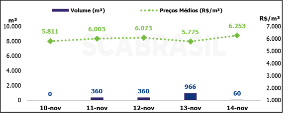 No levantamento realizado pela SCA Brasil, o mercado spot de biodiesel apresentou um volume de vendas de 1.746 m³ na semana, quase 90% acima em relação à anterior, com o destaque para o estado do Paraná, com volume comercializado de 546 m³. O preço médio apurado na semana foi de R$ 5.900/m³, com PIS/COFINS e sem ICMS, com uma desvalorização de 1,0% em relação à semana anterior.