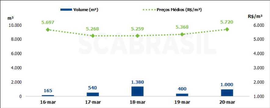 Depois de uma semana anterior com um volume de venda bem superior ao histórico recente, o mercado spot voltou a retrair em função do aumento dos preços e redução dos volumes ofertados pelas usinas, que priorizaram as fortes retiradas dos volumes dos contratos vigentes. No levantamento realizado pela SCA Brasil, foi apurado um volume de 3.485 m³ no mercado spot, com um preço médio de R$ 5.426/m³, com PIS/COFINS e sem ICMS, um aumento de 2,7% em relação à semana anterior.