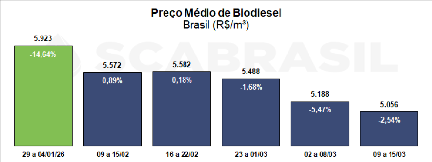 Segundo o levantamento realizado entre 09/03 e 15/03 pela ANP, o preço médio do biodiesel negociado entre usinas e distribuidores ficou em R$ 5.055,85, desvalorização de 2,54% em relação ao valor médio da semana anterior. As regiões Sul e Norte apresentaram as maiores desvalorizações, com 3,45% e 3,30% respectivamente. O mercado acumula uma redução de 14,64% no ano.