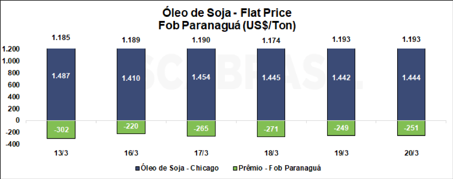 O contrato de maio/2026 do óleo de soja negociado na Bolsa de Chicago (CBOT, na sigla em inglês) fechou a 65,51 cents/libra na sexta-feira (13/03), apresentando desvalorização de 2,86% na semana. No entanto, o prêmio de abril/2026 do óleo de soja FOB Paranaguá subiu 230 pontos, compensado a queda do óleo, fechando a semana em -11,40 cents/lb. Dessa forma, o flat price do óleo de soja FOB Paranaguá fechou em US$ 1.192,92/ton, valorização de 0,69% em relação à semana anterior.