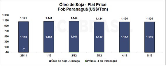 O contrato de janeiro/2025 do óleo de soja negociado na Bolsa de Chicago (CBOT, na sigla em inglês) encerrou em 51,69 cents/libra na sexta-feira (05/12), apresentando desvalorização de 0,69% na semana. O prêmio de janeiro/2025 do óleo de soja em FOB Paranaguá perdeu 30 pontos, fechando a semana em -0,60 cents/libra. O flat price do óleo de soja FOB Paranaguá fechou em US$ 1.126,34/ton, desvalorização de 1,28% em relação à semana anterior.