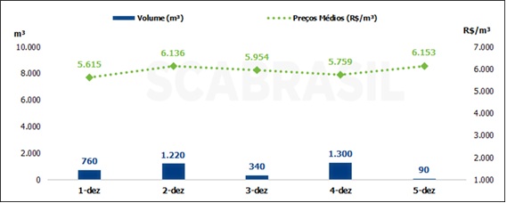 No levantamento realizado pela SCA Brasil, o mercado spot apresentou uma melhoria na liquidez em relação à semana anterior, com um volume apurado de 3.710 m³ na semana. O preço médio apurado na semana foi de R$ 5.881/m³, com PIS/COFINS e sem ICMS, com uma leve valorização de 2,5% em relação à semana anterior.
