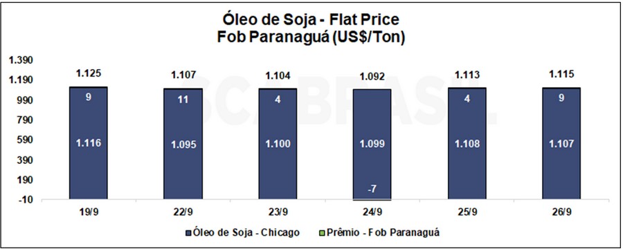O contrato de dezembro/2025 do óleo de soja negociado na Bolsa de Chicago (CBOT, na sigla em inglês) encerrou em 50,19 cents/libra na sexta-feira (26/09), apresentando desvalorização de 0,85% na semana. O prêmio de novembro/2025 do óleo de soja em FOB Paranaguá ficou estável, fechando a semana em 0,40 cents/libra. O flat price do óleo de soja FOB Paranaguá fechou em US$ 1.115,32/ton, praticamente em linha com a semana anterior.
