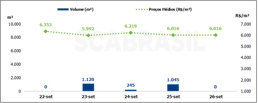 No levantamento realizado pela SCA Brasil, o mercado spot de biodiesel teve na semana um volume de vendas de 2.410 m³, aumento de 50% em relação à semana anterior, com os destaques para os estados da Bahia e Mato Grosso com volumes comercializados de 1.000 m³ e 700 m³. O preço médio apurado na semana foi de R$ 6.026/m³, com PIS/COFINS e sem ICMS, com desvalorização de 2,8% em relação à semana anterior.