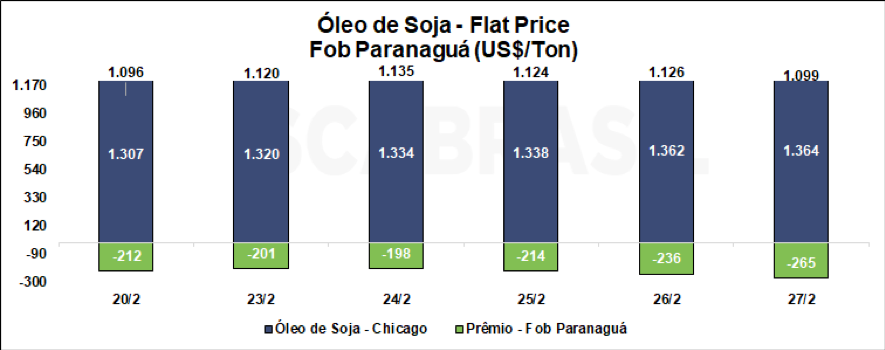 O contrato de maio/2026 do óleo de soja negociado na Bolsa de Chicago (CBOT, na sigla em inglês) encerrou em 61,85 cents/libra na sexta-feira (27/02), apresentando valorização de 4,30% na semana. No mercado doméstico, o prêmio de abril/2026 do óleo de soja FOB Paranaguá caiu fortemente, compensando grande parte da subida no mercado internacional, fechando a semana em -12,00 cents/lb. Dessa forma, o flat price do óleo de soja FOB Paranaguá fechou em US$ 1.099,01/ton, valorização de 0,30% em relação à semana anterior.