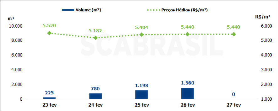 O mercado spot apresentou uma semana com alguma liquidez, apesar do mercado estar envolvido nas negociações para os contratos do segundo bimestre do ano, e no levantamento realizado pela SCA Brasil, foi apurado um volume de 3.763 m³. O preço médio foi de R$ 5.380/m³, com PIS/COFINS e sem ICMS, um aumento de 4% em relação à semana anterior.
