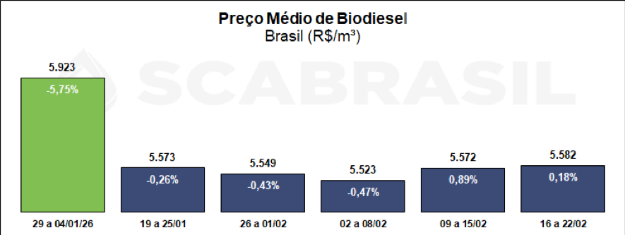 Segundo o levantamento realizado entre 16/02 e 22/02 pela ANP, o preço médio do biodiesel negociado entre usinas e distribuidores ficou em R$ 5.581,95, valorização de 0,18% em relação ao valor médio da semana anterior. A região Centro-Oeste apresentou a maior valorização com 1,39% e a região Norte apresentou a maior desvalorização com 0,99%. O mercado acumula uma redução de 5,75% no ano.